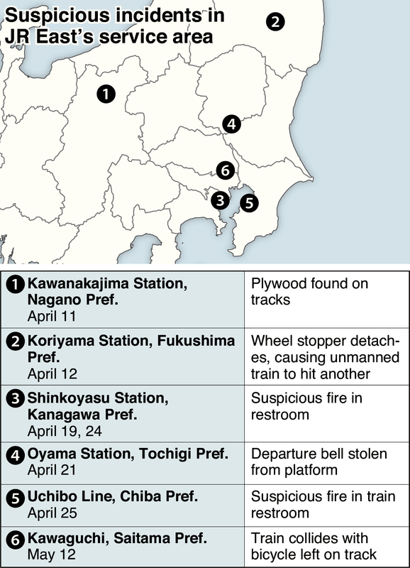 Though it is uncertain if the cases are linked, some of them are thought to be malicious in nature and could have led to serious accidents. JR East, which has filed reports of damage to the police and installed additional security cameras, feels a sense of danger about the situation.