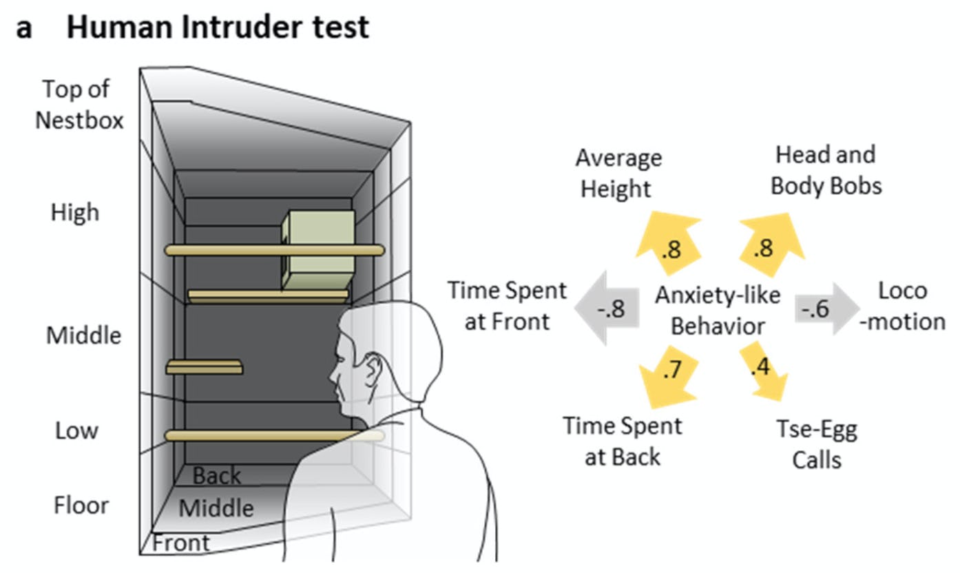 The scientists used these behavioral cues to create anxiety scores for each animal. The animals with the highest anxiety scores spent the majority of their time towards the back of the cage, high up, remaining relatively still, and making head and body bobs and calls, the study reports.
