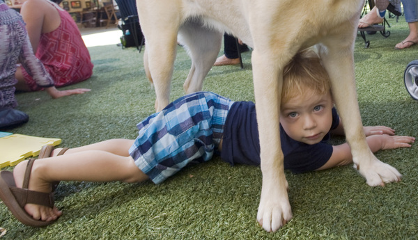 The 1-year-old wanted to be as close as he could to the dogs that sat around Sean Hanrahan, who was getting ready to read "Raising a Hero," a book about a puppy that grows up to be a service dog.
