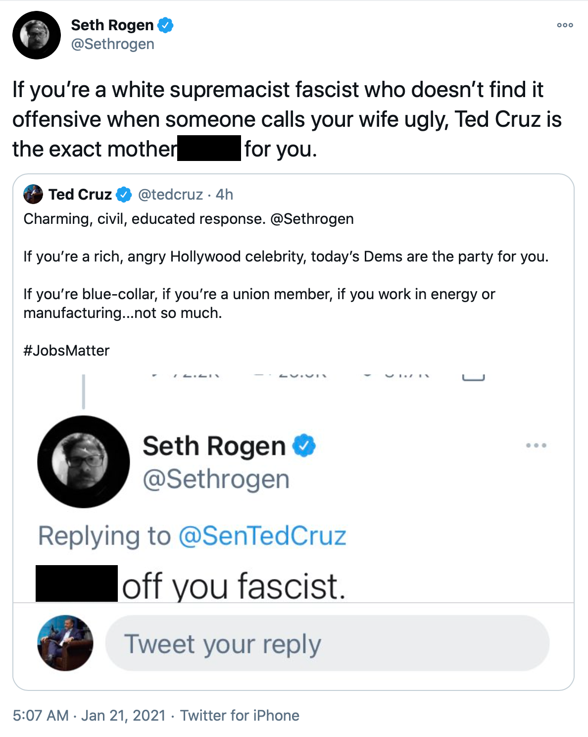 In response, Rogen went for the jugular. “If you’re a white supremacist fascist who doesn’t find it offensive when someone calls your wife ugly, Ted Cruz is the exact motherf***** for you,” he tweeted.