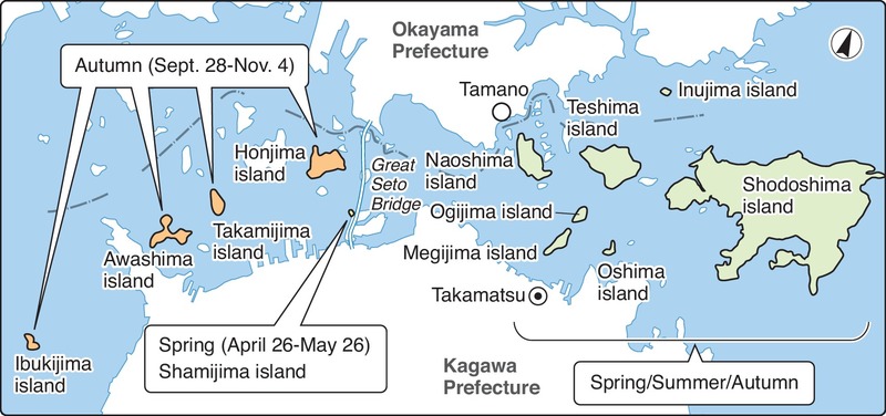 First held in 2010 to vitalize islands suffering from depopulation, the festival takes place every three years. The current festival marks the fourth edition and is being staged across 12 islands in Kagawa and Okayama prefectures, as well as at Takamatsu Port in Takamatsu and Uno Port in Tamano, Okayama Prefecture.