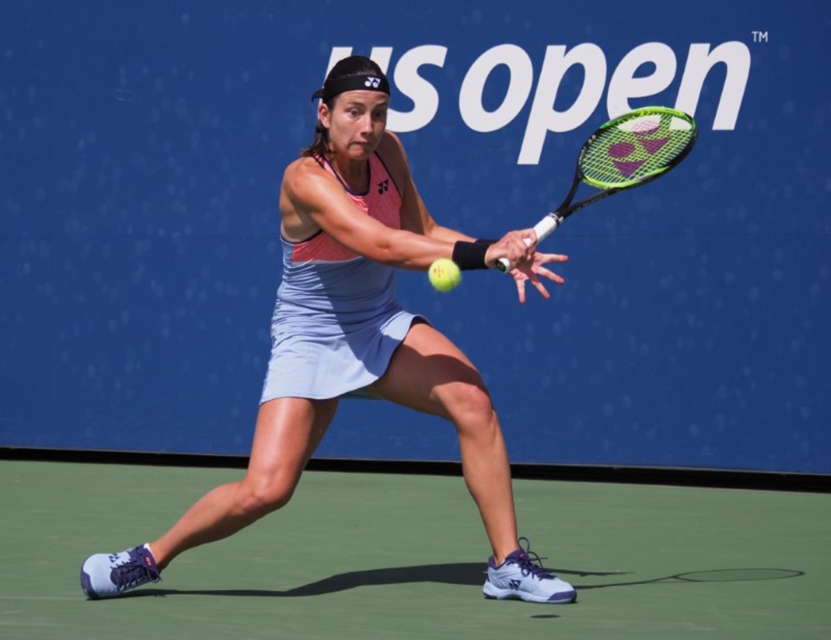 Aug 26, 2019; Flushing, NY, USA; Anastasija Sevastova of Latvia returns a shot against Eugenie Bouchard of Canada in a first round match on day one of the 2019 U.S. Open tennis tournament at USTA Billie Jean King National Tennis Center. Mandatory Credit: Jerry Lai-USA TODAY Sports