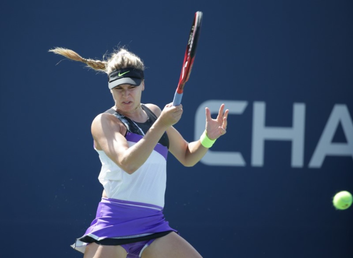 Aug 26, 2019; Flushing, NY, USA; Eugenie Bouchard of Canada returns a shot against Anastasija Sevastova of Latvia in a first round match on day one of the 2019 U.S. Open tennis tournament at USTA Billie Jean King National Tennis Center. Mandatory Credit: Jerry Lai-USA TODAY Sports