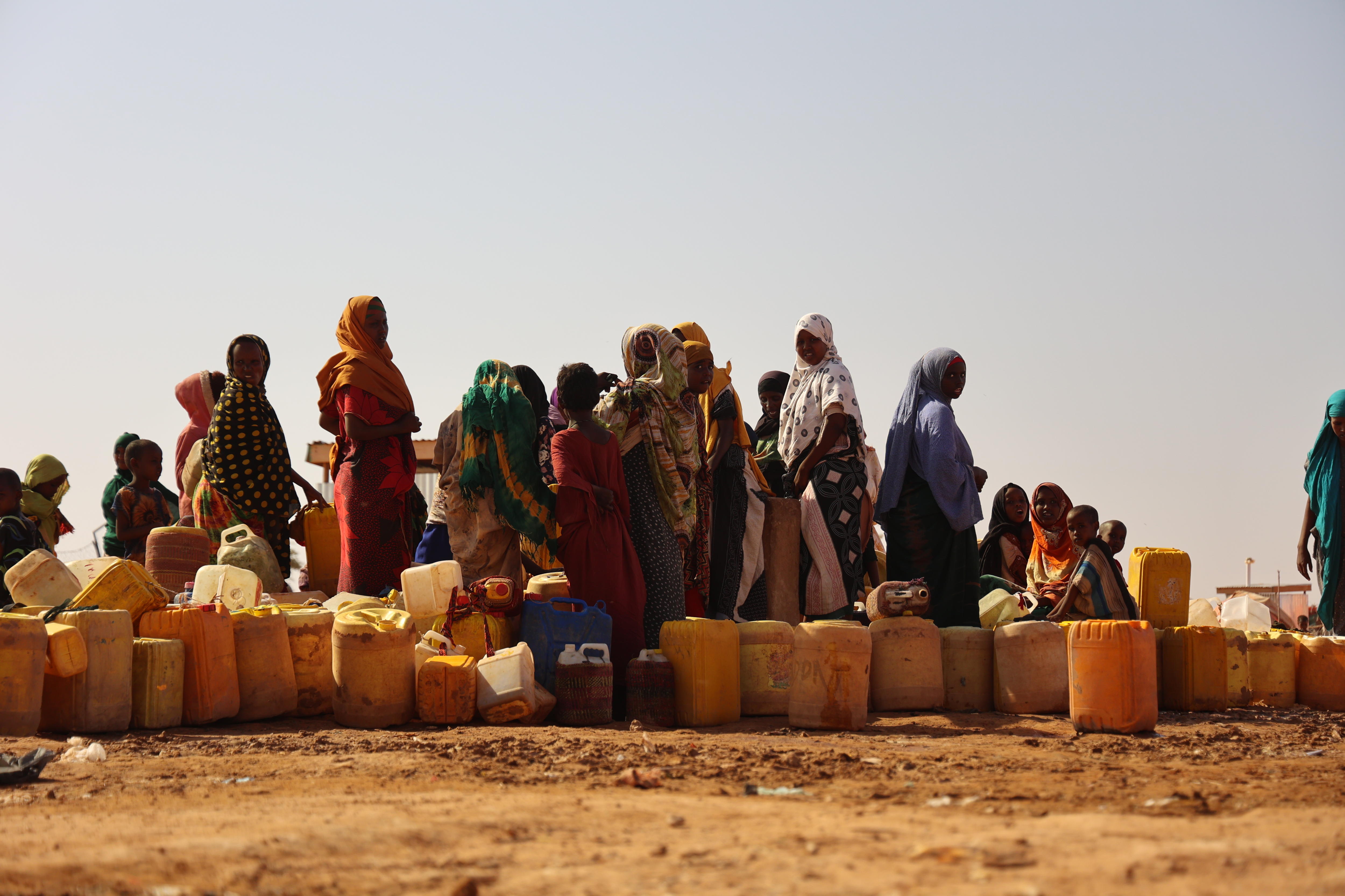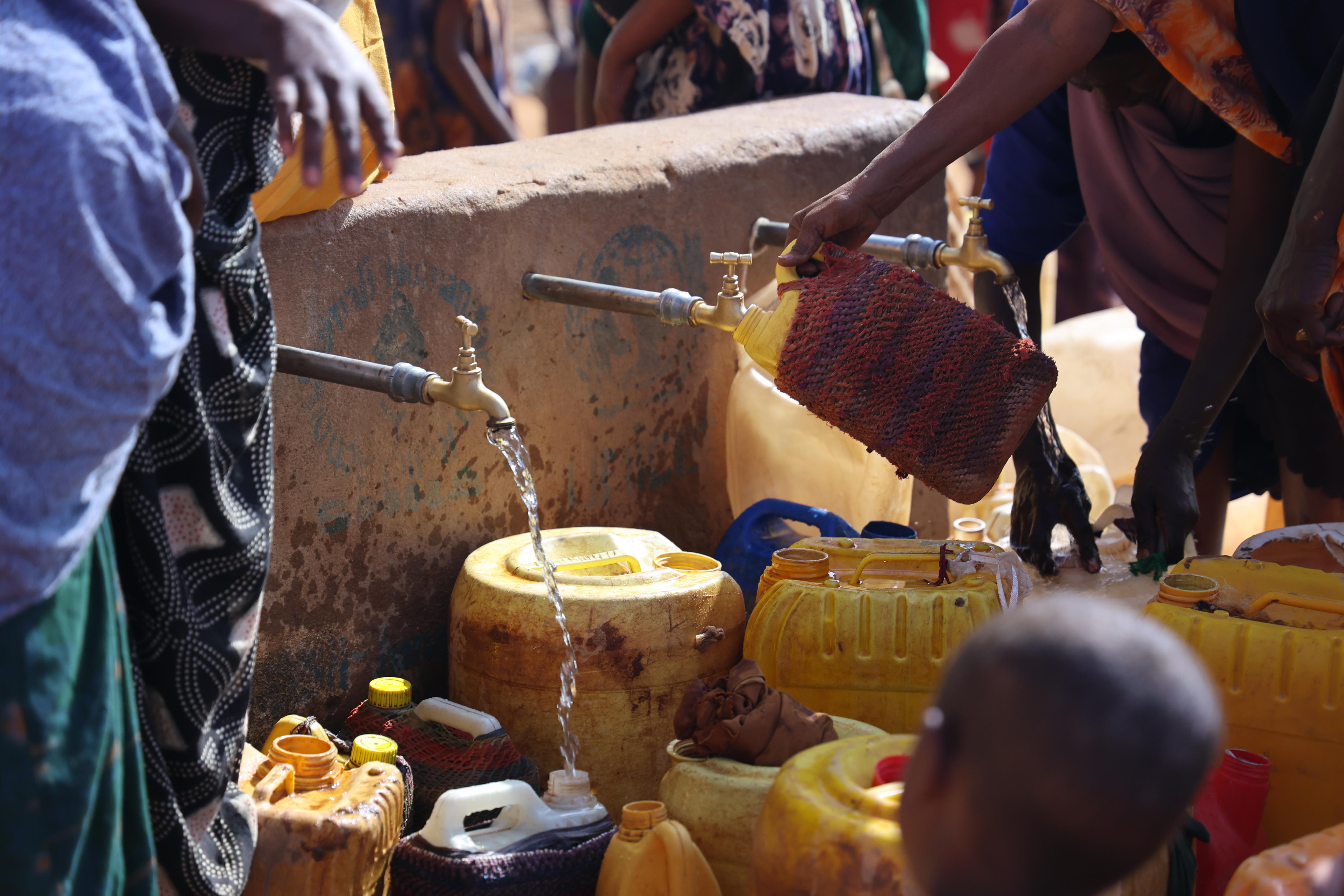People line up with jerry cans at a communal tap but supply isn't guaranteed.