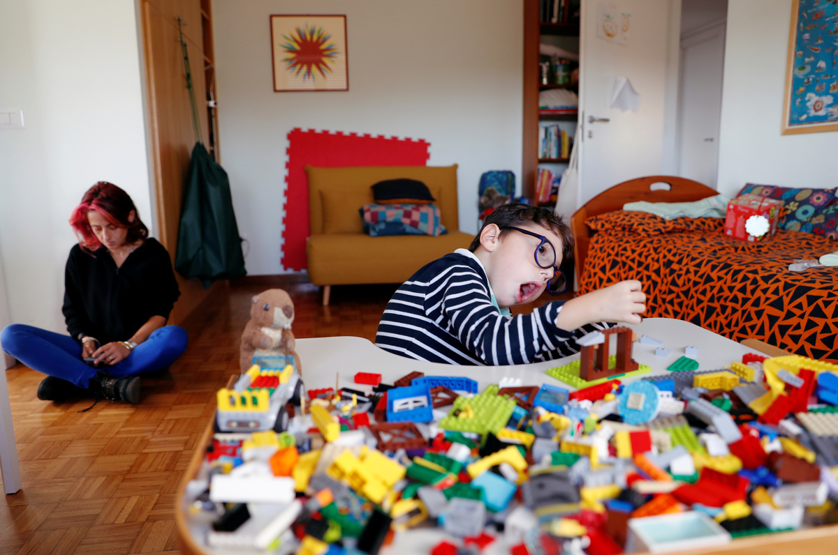 Sirio Persichetti, a 7-year-old Italian with spastic tetraplegia and cerebral palsy who has become an influencer by challenging perceptions of disability, builds a house out of lego, as his mum Valentina Perniciaro rests beside him, in Rome, Italy, October 20, 2020. Picture taken October 20, 2020. REUTERS/Yara Nardi