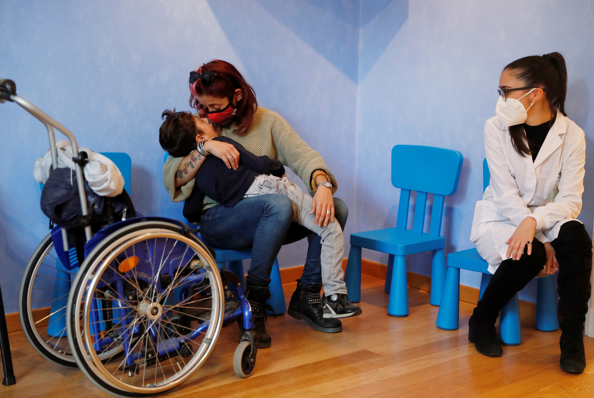 Valentina Perniciaro, wearing a protective mask, holds her son Sirio Persichetti, a 7-year-old with spastic tetraplegia and cerebral palsy who has become an influencer by challenging perceptions of disability, as they visit a health clinic to try his new hearing aid, in Rome, Italy, October 21, 2020. Picture taken October 21, 2020. REUTERS/Yara Nardi