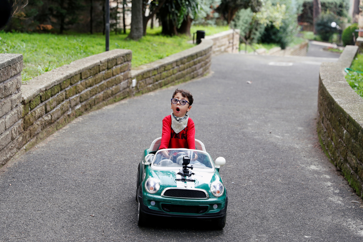 Sirio Persichetti, a 7-year-old Italian with spastic tetraplegia and cerebral palsy who has become an influencer by challenging perceptions of disability, drives his toy car in the frontyard of his home in Rome, Italy, October 23, 2020. Picture taken October 23, 2020. REUTERS/Yara Nardi