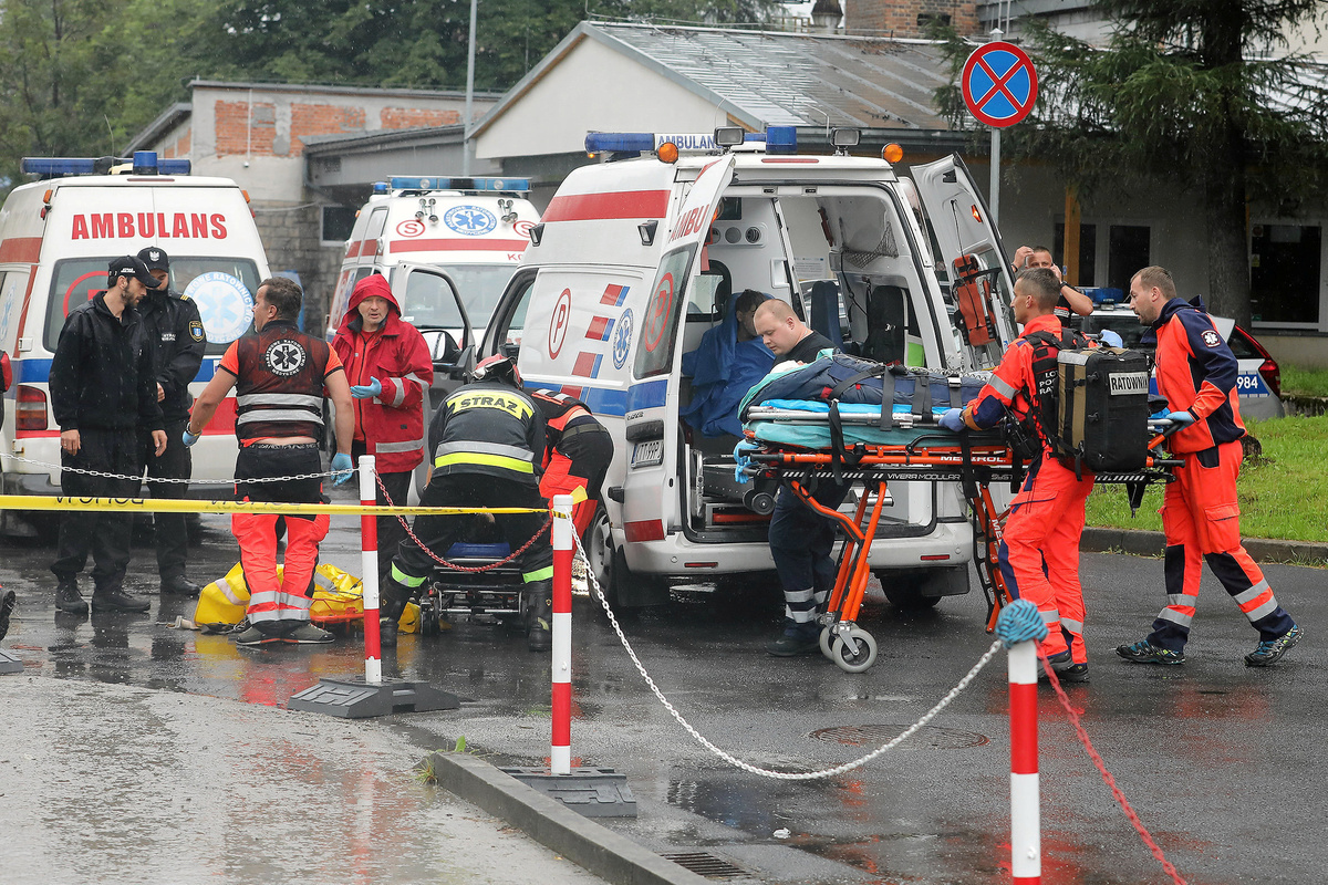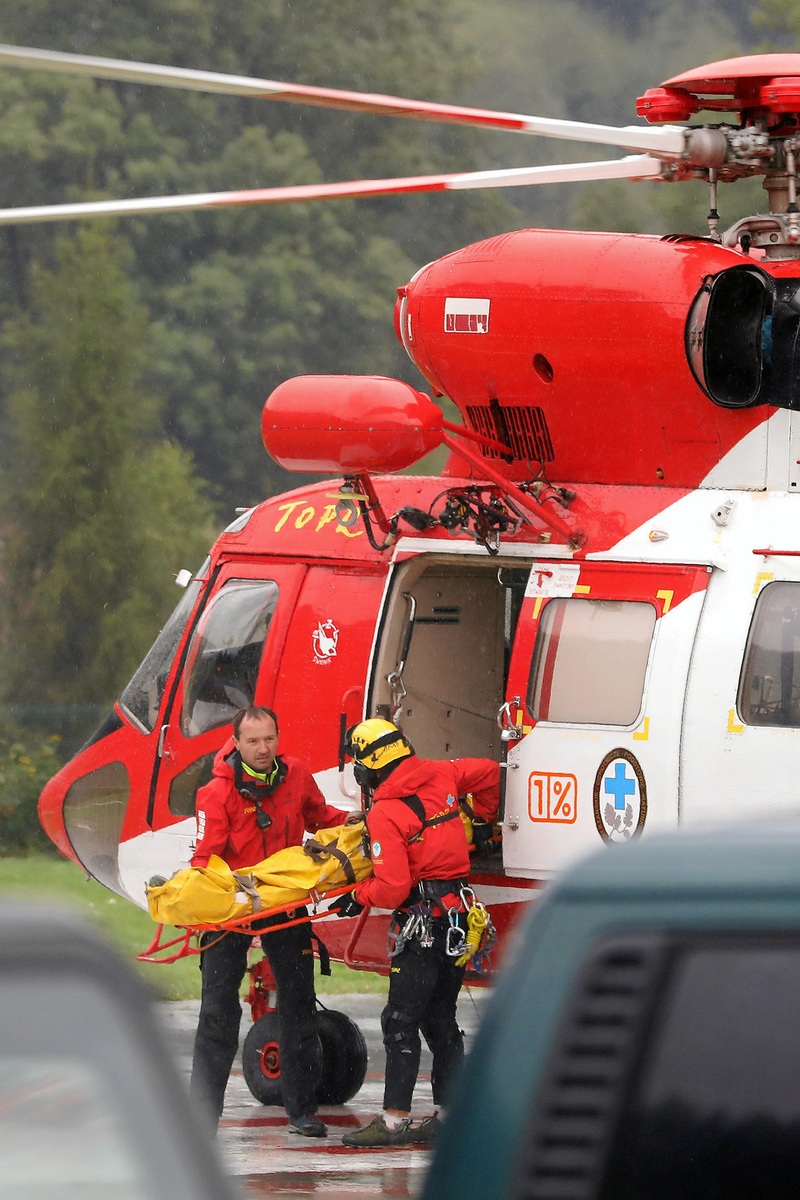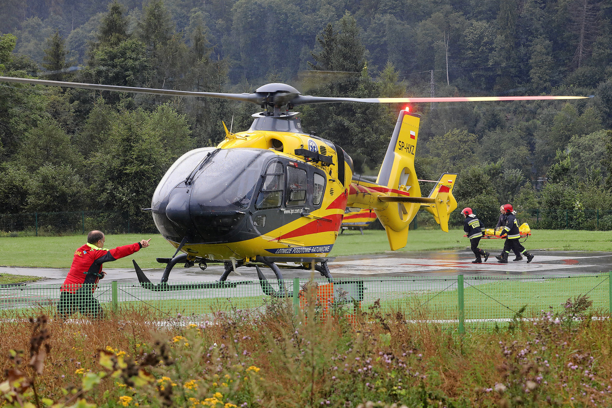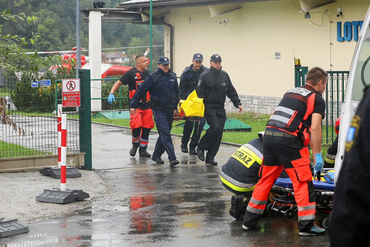 Police officers and medical staff carry a stretcher to an ambulance during a rescue operation after a thunderstorm in the Tatra Mountains, in Zakopane, Poland August 22, 2019. Picture taken August 22, 2019. Agencja Gazeta/Marek Podmokly via REUTERS A TOPR (Tatra Volunteer Search and Rescue) helicopter and an ambulance are seen as rescuers conduct a rescue operation after a thunderstorm in the Tatra Mountains, in Zakopane, Poland August 22, 2019. Agencja Gazeta/Marek Podmokly via REUTERSAn HEMS Polish Medical Air Rescue (LPR) helicopter takes part in a rescue operation after a thunderstorm in the Tatra Mountains, in Zakopane, Poland August 22, 2019. Agencja Gazeta/Marek Podmokly via REUTERSA TOPR (Tatra Volunteer Search and Rescue) helicopter takes part in a rescue operation after a thunderstorm in the Tatra Mountains, in Zakopane, Poland August 22, 2019. Agencja Gazeta/Marek Podmokly via REUTERS