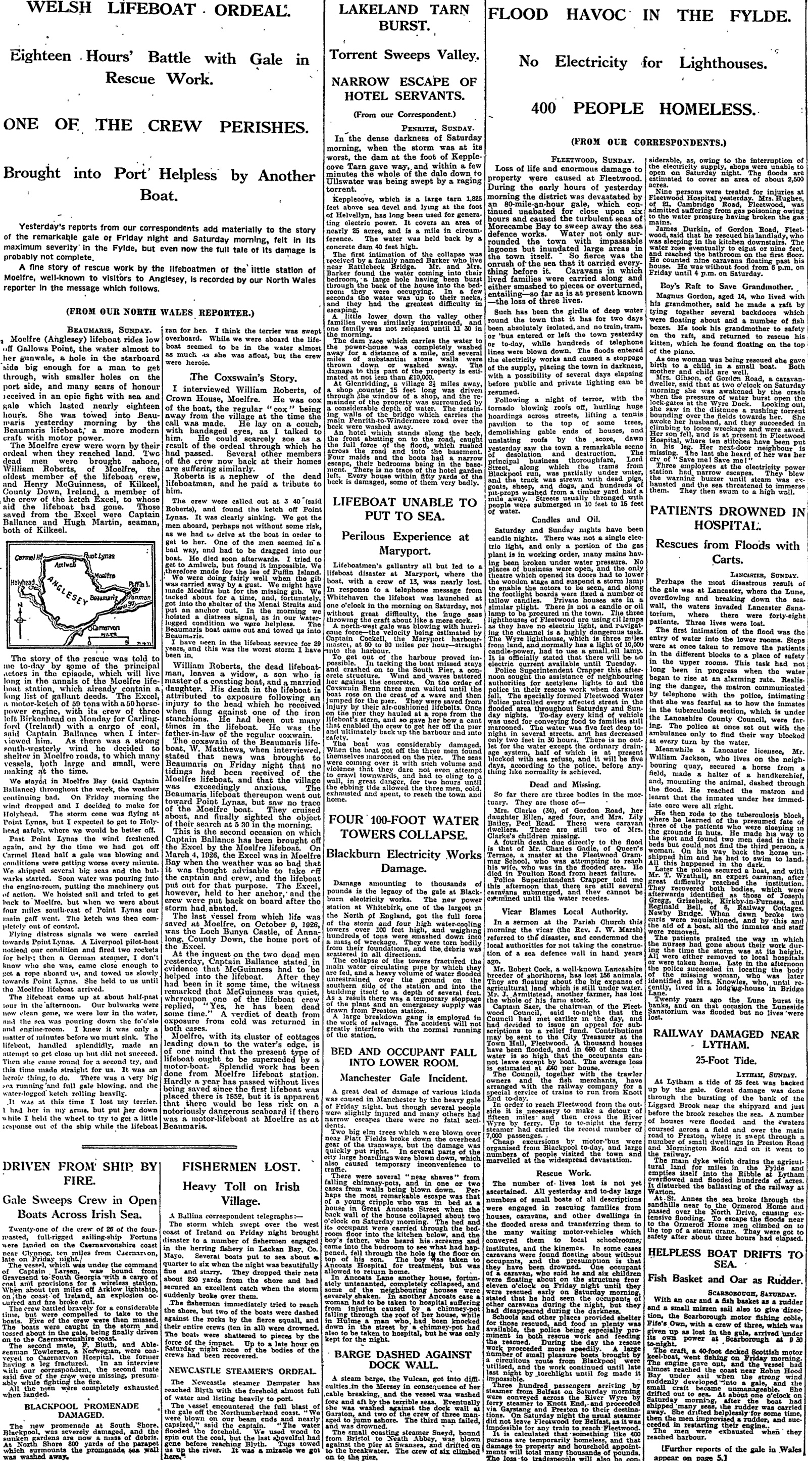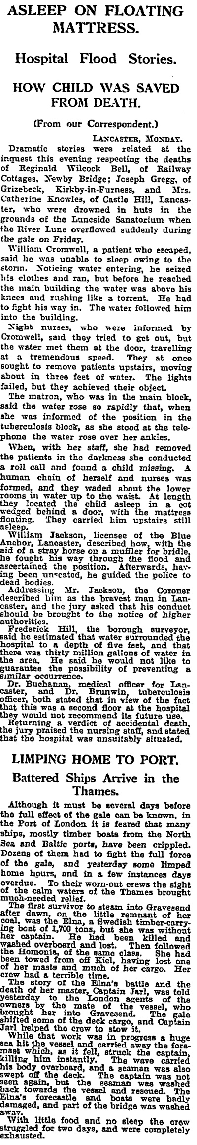 The Manchester Guardian carried dramatic eyewitness accounts of the flooding of the sanatorium in Lancaster that led to three deaths.