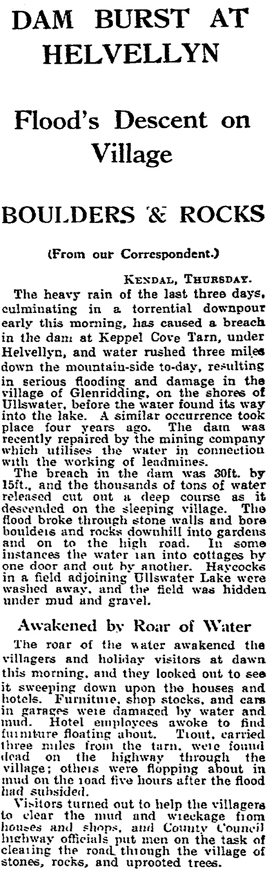 Four years later the dam was breached again, releasing thousands of tons of water from Keppel Cove Tarn and flooding Glenridding once more.