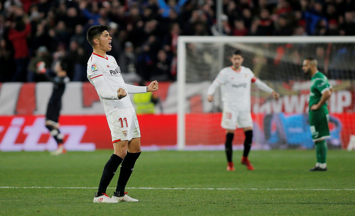 Soccer Football - Spanish King's Cup Semi Final Second Leg - Sevilla vs Leganes - Ramon Sanchez Pizjuan, Seville, Spain - February 7, 2018 Sevilla’s Joaquin Correa celebrates after the match REUTERS/Jon Nazca