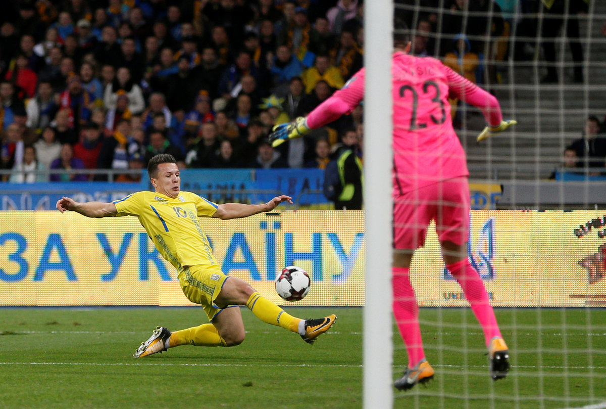 Needing a win to grab second place in the group, the home side took control, wasting two great chances around the half-hour mark, with Taras Stepanenko driving a powerful shot outside the post and Yevhen Konoplyanka heading just wide moments later.