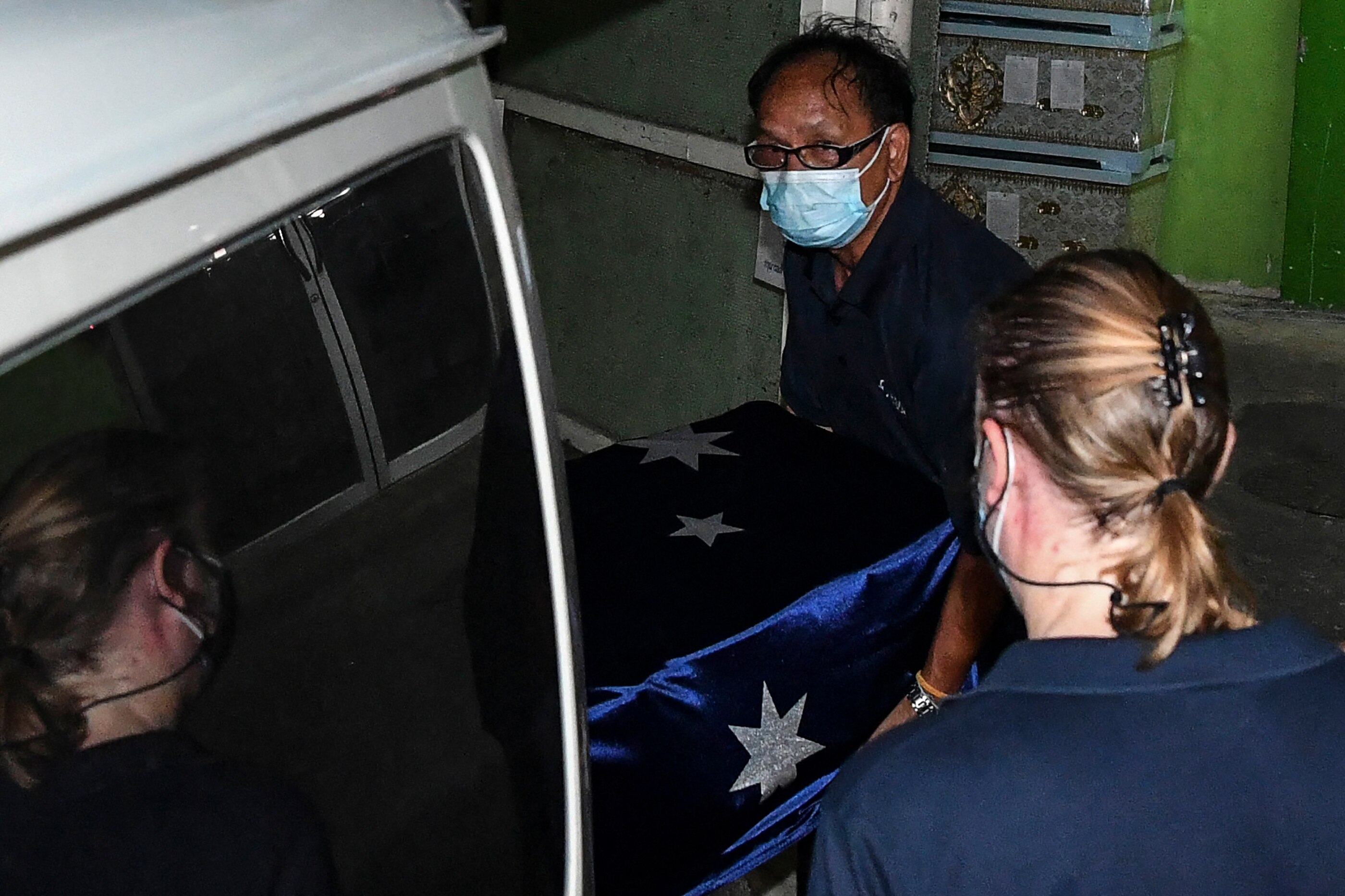 His casket was pictured this morning draped in an Australian flag being loaded into a van from a Bangkok morgue.