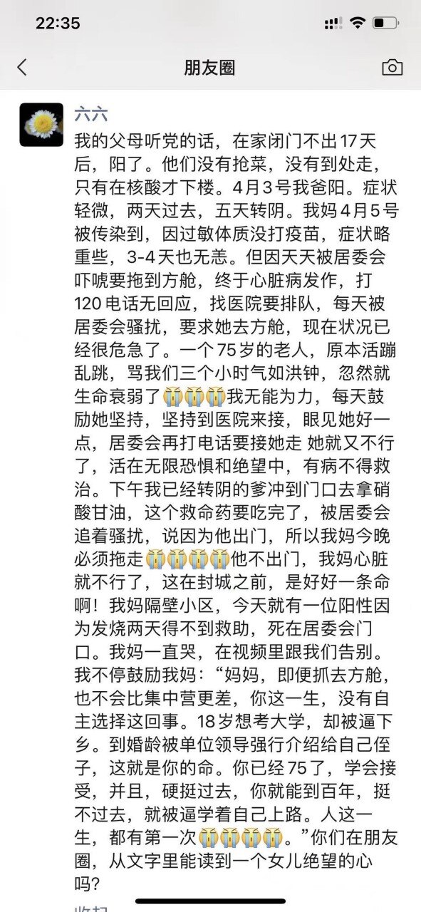 Meanwhile Liuliu, a famous script writer in China, posted on WeChat Moment that his 75-year-old mother had a heart attack after testing positive for COVID-19 and being forced into a quarantine hospital.