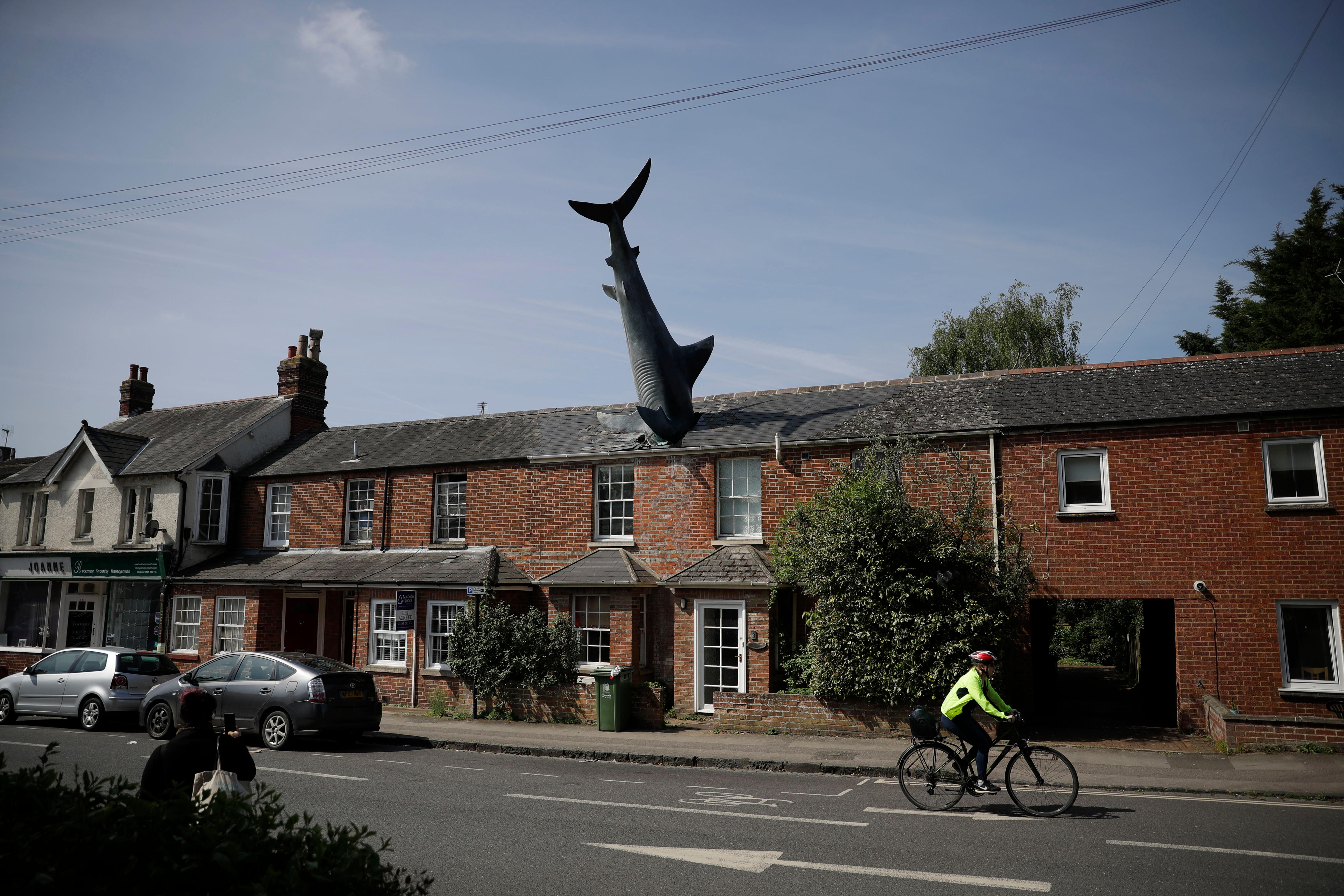 But the sight of three-quarters of a great white shark sticking out of the roof of a row of brick houses on a quiet suburban street isn't always a serious subject.