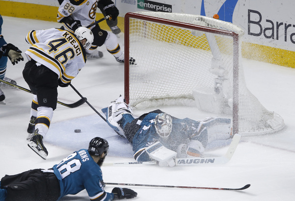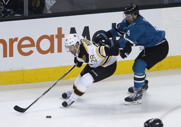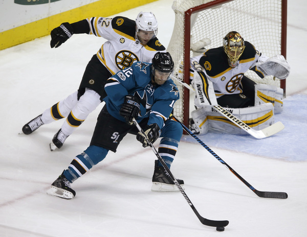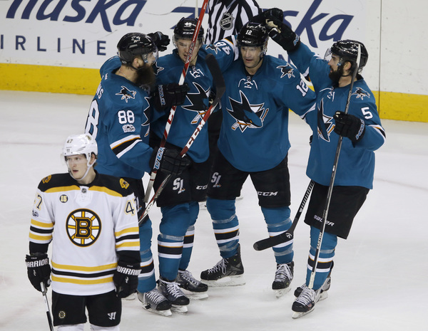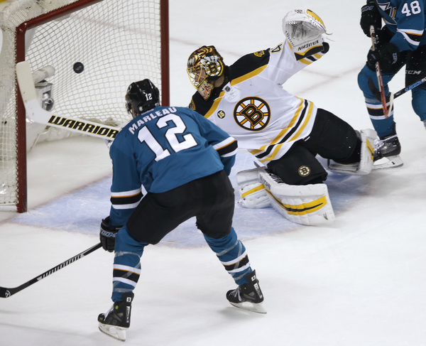 On a 4-on-4 situation, a shot from Brent Burns went off the leg of Torey Krug right to Marleau, who had a mostly open net as Tuukka Rask was unable to get over in time.