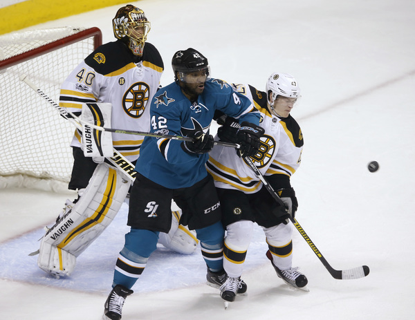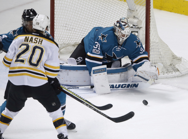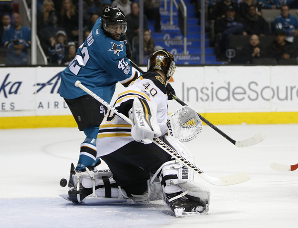 The Sharks allowed the first goal on home ice for the third straight game as Ryan Spooner was left alone right beside Martin Jones.