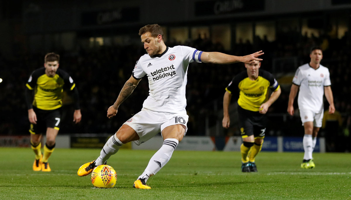 Soccer Football - Championship - Burton Albion vs Sheffield United - Pirelli Stadium, Burton, Britain - November 17, 2017 Billy Sharp scores Sheffield United's first goal Action Images/Carl Recine