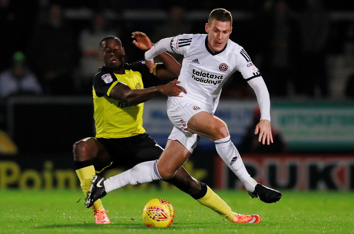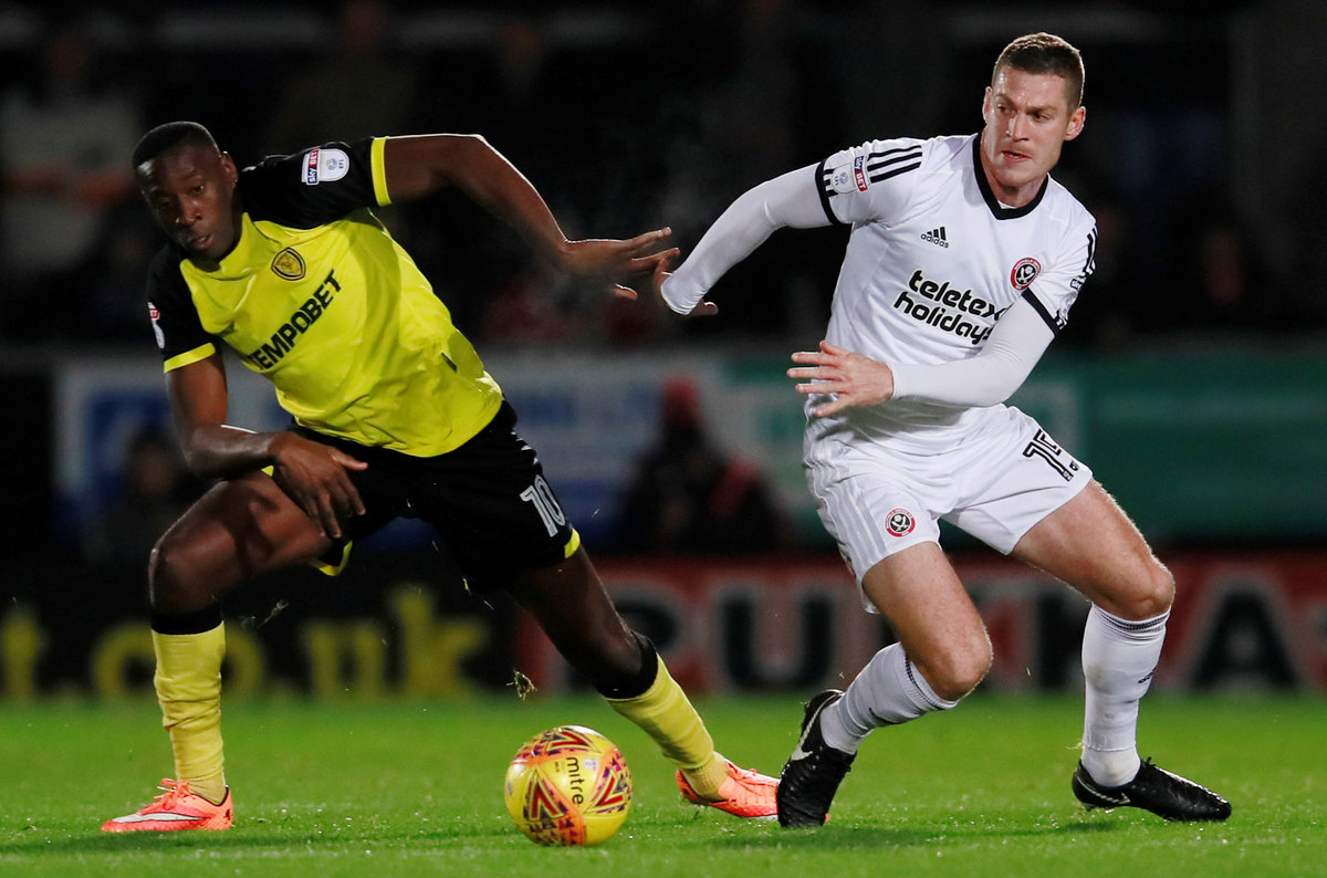 Soccer Football - Championship - Burton Albion vs Sheffield United - Pirelli Stadium, Burton, Britain - November 17, 2017 Sheffield United's Paul Coutts in action with Burton Albion's Lucas Akins Action Images/Jason Cairnduff