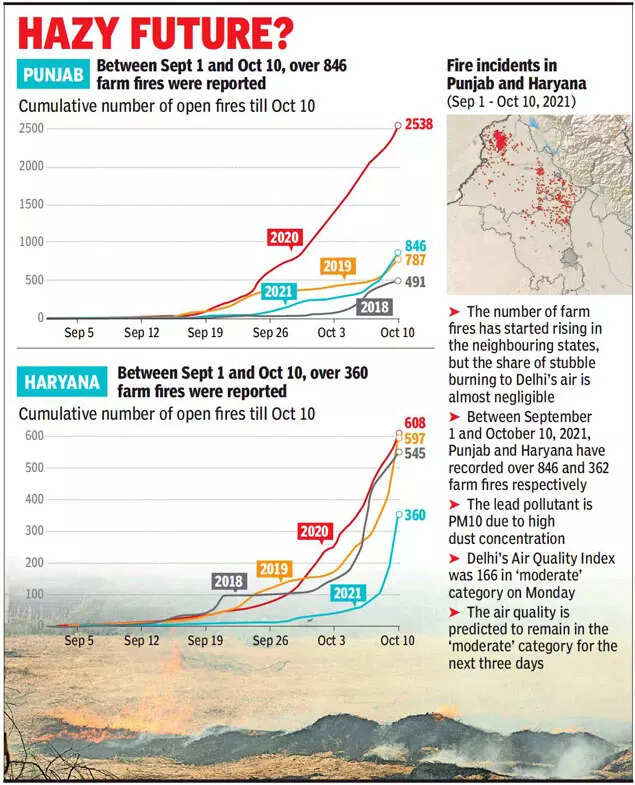 Gufran Beig, who founded the Union earth ministry’s forecasting body System of Air Quality and Weather Forecasting And Research, or SAFAR, informed TOI, “Though the number of farm fires have started rising in the neighbourhood of Delhi, the contribution of stubble burning to the city’s air is less than 5% with only a nominal increase recorded in the PM2.5 level. Due to high local winds and dust lifting, the lead pollutant is PM10 rather than PM2.5.”