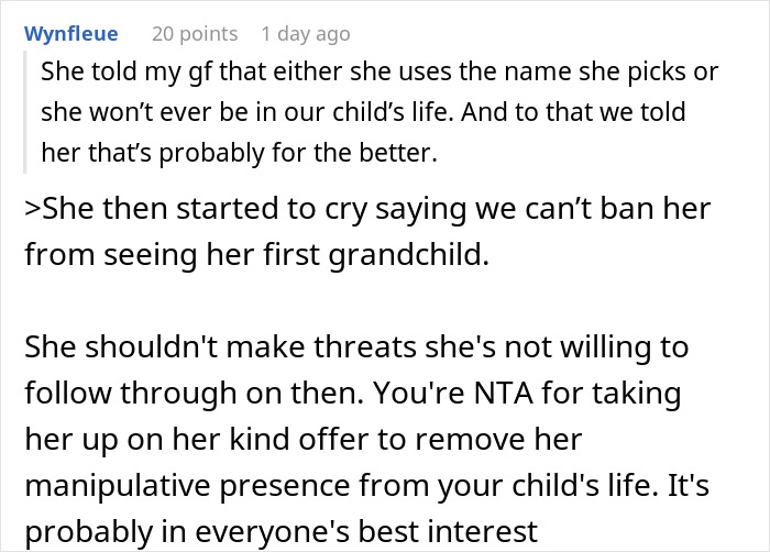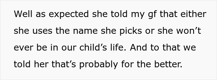 She then threatened them, saying she wouldn’t be in her grandchild’s life if they didn’t pick the name, to which they replied that it was probably for the better