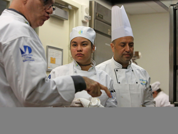 Four groups of four students in their white chef's coats huddle in separate sections of an ice-box-cold kitchen where, on this day, Escobar and the others begin to learn to cook meat. They disagree on who will chop which vegetables for side dishes.