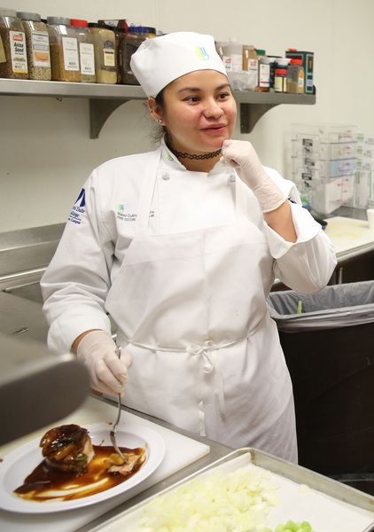 Her eyes dart between the loin she is pan-basting with sizzling oil and jus, to her instructor on her right and the interpreter on her left who is translating the chef's instructions into American Sign Language.