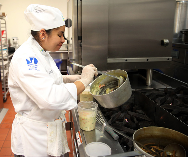 "When the bottom has color, do exactly this," her chef instructor at Miami Dade College's Miami Culinary Institute, Bernardo Espinel, says.