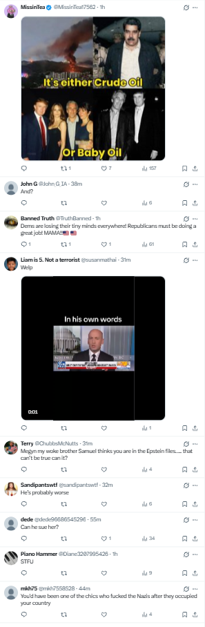 You are as disgusting as ever. And it's a very fair comparison. It's on fucking believable that you can show that motherf***** sympathy, but you trash Alex Perretti, who was actually a really good person (sic)" and yet another reacted, "Dems are losing their tiny minds everywhere! Republicans must be doing a great job! MAMA!! (sic)."