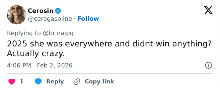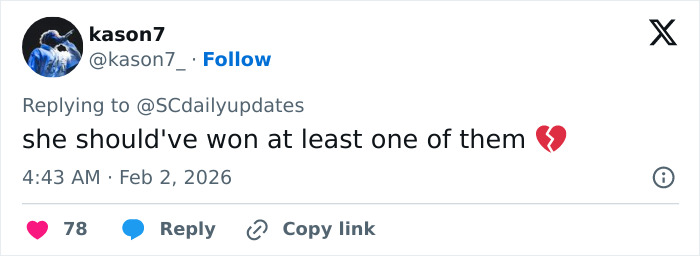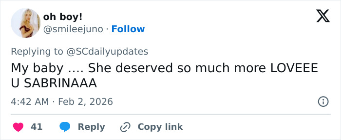 “Seeing Sabrina’s face after Lady Gaga’s win actually had me in tears,” wrote a netizen, while another commented, “Awww, this is making me sad.”