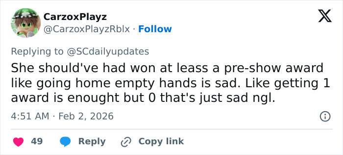 “Sabrina Carpenter, we know how you feel,” a netizen wrote under a snapshot of the singer seemingly holding back tears at the Grammys. At the same time, another added two sad face emojis alongside the caption, “Sabrina’s reaction to not winning any Grammys.”