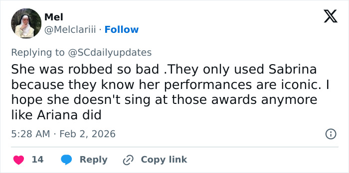 “No I truly think Sabrina was so snubbed,” said one on social media about Carpenter’s 68th Grammy Awards run