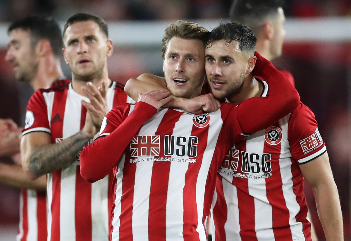Soccer Football - Premier League - Sheffield United v Arsenal - Bramall Lane, Sheffield, Britain - October 21, 2019 Sheffield United's John Fleck and Jack O'Connell celebrate after the match Action Images via Reuters/Carl Recine