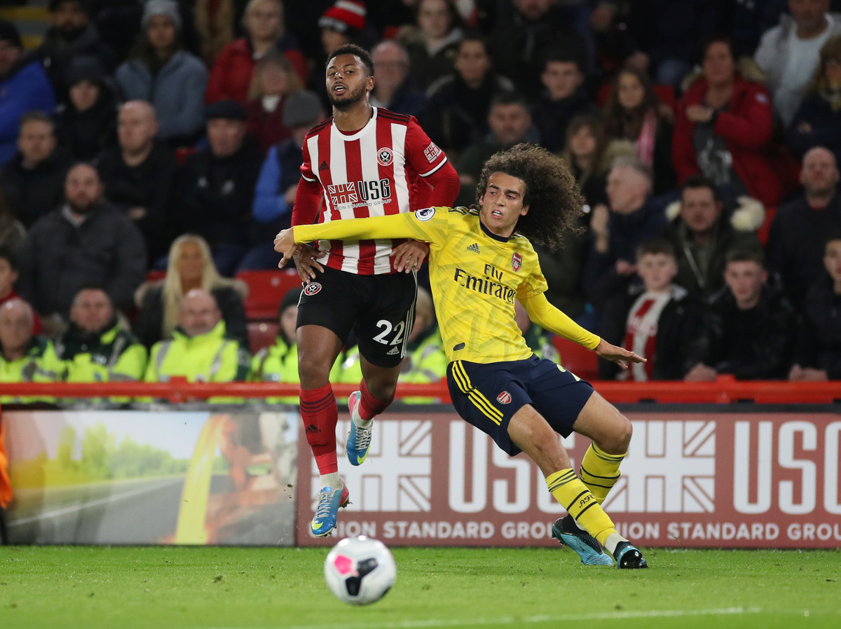 Soccer Football - Premier League - Sheffield United v Arsenal - Bramall Lane, Sheffield, Britain - October 21, 2019 Sheffield United's Lys Mousset in action with Arsenal's Matteo Guendouzi Action Images via Reuters/Carl Recine