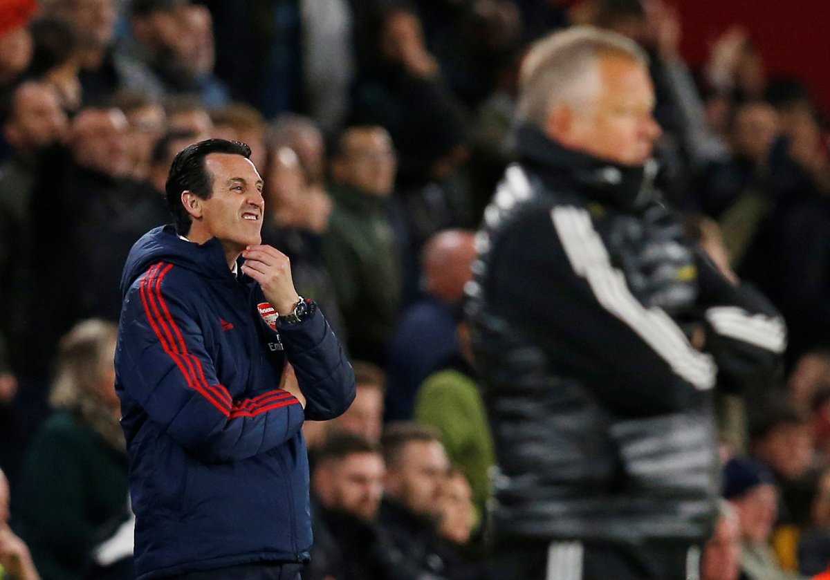 Soccer Football - Premier League - Sheffield United v Arsenal - Bramall Lane, Sheffield, Britain - October 21, 2019 Sheffield United's John Lundstram in action with Arsenal's Sead Kolasinac REUTERS/Andrew Yates Soccer Football - Premier League - Sheffield United v Arsenal - Bramall Lane, Sheffield, Britain - October 21, 2019 Arsenal's Pierre-Emerick Aubameyang in action with Sheffield United's Chris Basham REUTERS/Andrew Yates Soccer Football - Premier League - Sheffield United v Arsenal - Bramall Lane, Sheffield, Britain - October 21, 2019 Arsenal's Bernd Leno in action with Sheffield United's David McGoldrick REUTERS/Andrew Yates Soccer Football - Premier League - Sheffield United v Arsenal - Bramall Lane, Sheffield, Britain - October 21, 2019 Arsenal's Matteo Guendouzi and Calum Chambers with Sheffield United's Billy Sharp and Oliver McBurnie at the end of the match Action Images via Reuters/Carl Recine Soccer Football - Premier League - Sheffield United v Arsenal - Bramall Lane, Sheffield, Britain - October 21, 2019 Sheffield United's Luke Freeman and George Baldock celebrate after the match Action Images via Reuters/Carl Recine Soccer Football - Premier League - Sheffield United v Arsenal - Bramall Lane, Sheffield, Britain - October 21, 2019 Sheffield United manager Chris Wilder celebrates after the match REUTERS/Andrew Yates Soccer Football - Premier League - Sheffield United v Arsenal - Bramall Lane, Sheffield, Britain - October 21, 2019 Arsenal's Pierre-Emerick Aubameyang in action with Sheffield United's Chris Basham REUTERS/Andrew Yates Soccer Football - Premier League - Sheffield United v Arsenal - Bramall Lane, Sheffield, Britain - October 21, 2019 Arsenal's Alexandre Lacazette Action Images via Reuters/Carl Recine Soccer Football - Premier League - Sheffield United v Arsenal - Bramall Lane, Sheffield, Britain - October 21, 2019 Arsenal manager Unai Emery and Sheffield United manager Chris Wilder REUTERS/Andrew Yates