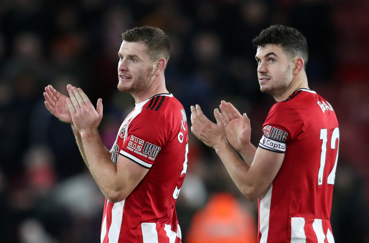 Soccer Football - Premier League - Sheffield United v Aston Villa - Bramall Lane, Sheffield, Britain - December 14, 2019 Sheffield United's Jack O'Connell and John Egan celebrate after the match REUTERS/Jon Super