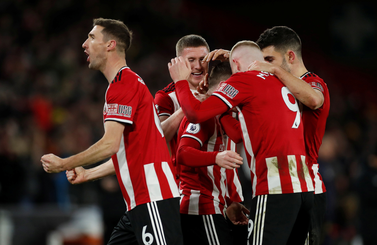 Soccer Football - Premier League - Sheffield United v Aston Villa - Bramall Lane, Sheffield, Britain - December 14, 2019 Sheffield United's John Fleck celebrates scoring their second goal with teammates Action Images via Reuters/Lee Smith