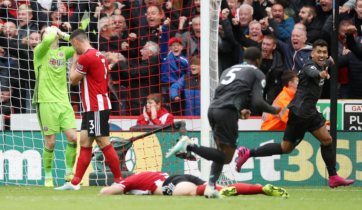Soccer Football - Premier League - Sheffield United v Liverpool - Bramall Lane, Sheffield, Britain - September 28, 2019 Liverpool's Georginio Wijnaldum celebrates scoring their first goal with Roberto Firmino as Sheffield United's Dean Henderson and team mates look dejected Action Images via Reuters/Carl Recine