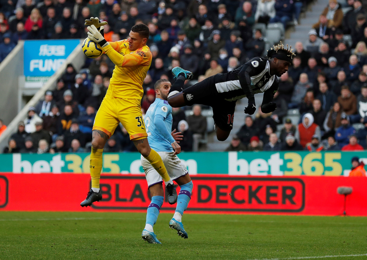 Soccer Football - Premier League - Newcastle United v Manchester City - St James' Park, Newcastle, Britain - November 30, 2019 Manchester City's Ederson in action with Newcastle United's Allan Saint-Maximin Action Images via Reuters/Lee Smith