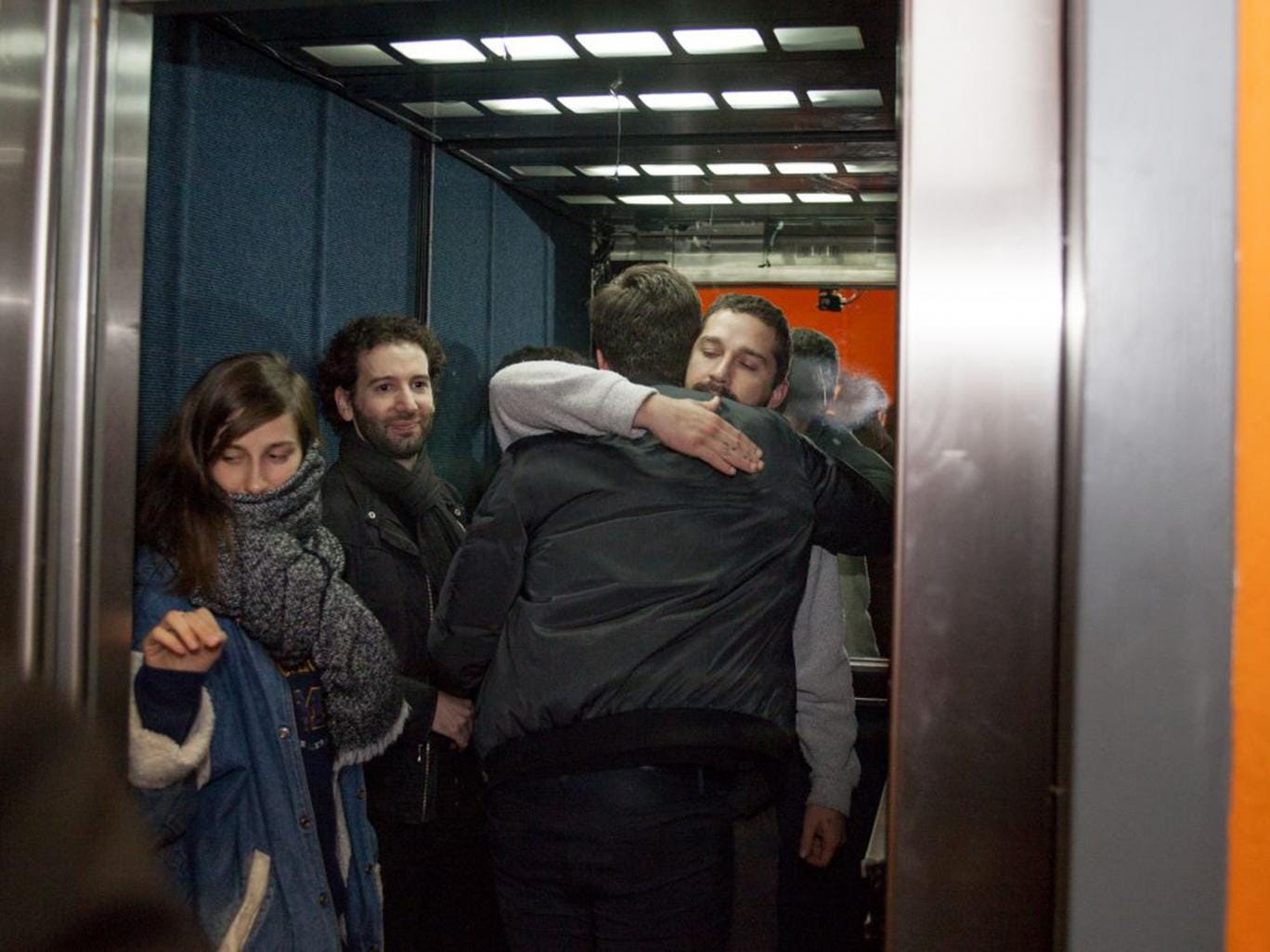 Dubbed #ELEVATE, the “act of enforced intimacy” saw LaBeouf and his two artistic collaborators, Nastja Ronkko and Luke Turner, occupying a tiny lift. Members of the public – some of whom queued for 12 hours for the privilege – were invited to join the trio in the elevator and ask questions.