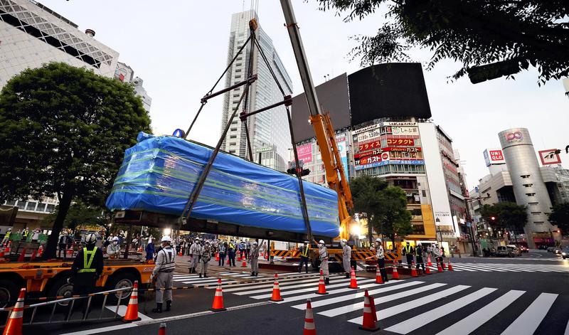 The relocation work began Monday before dawn. Workers placed rollers under Aogaeru, covered it with tarps and then moved it to the Shibuya intersection. A crane then lifted the car onto a trailer that departed around 5:15 a.m. Train fans gathered to watch the operation and there was an air of mournful lament as the enthusiasts took their final pictures in Tokyo of the beloved monument.