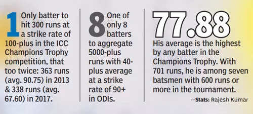 In ICC tournaments he averages 65.15, the best ever, and he played a prominent role in the 2013 Champions Trophy win. He forged 18 century stands with Rohit Sharma, the second best for an opening pair behind Ganguly and Tendulkar. His ODI career average of 44.11 is only behind Kohli, Dhoni, Rohit and Tendulkar. That makes Dhawan fifth best. He’ll take that, no questions asked.