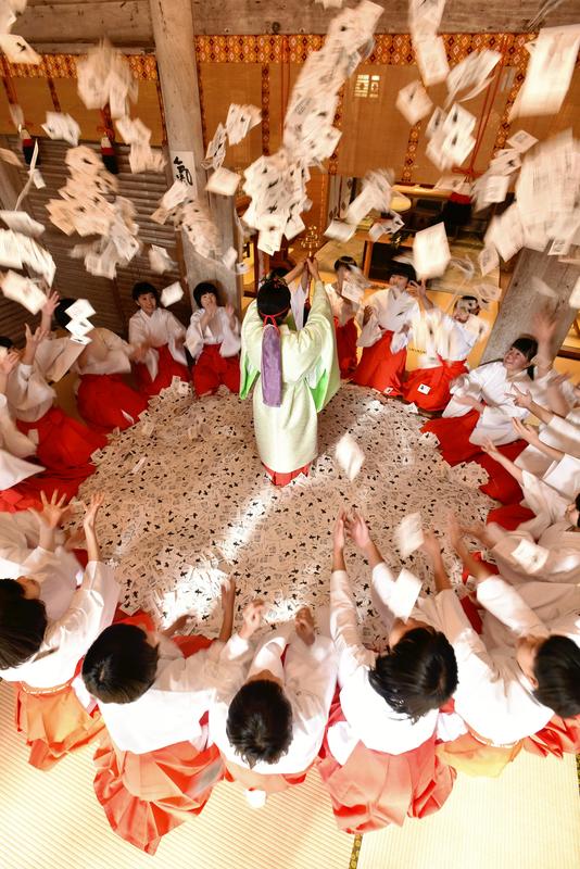 Female junior high school students dressed white kimonos and red hakama trousers, sitting in a circle, throw omikuji fortunes in the air in response to the jingling of a bell held by a miko female shrine attendant who stands at a center of the circle, at Keta Taisha shrine in Hakui, Ishikawa Prefecture, in Japan on Saturday. This annual event is held to mix together 50 variations of omikuji -- about 200,000 fortunes in all -- in preparation for the New Year holiday period when shrine visitors pray and buy omikuji.