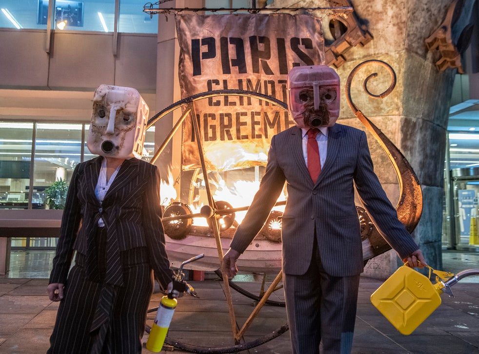 On Sunday, protesters from Ocean Rebellion - a group affiliated with Extinction Rebellion - wore pinstripe suits and masks made from salvaged waste oil containers found washed up on a Cornish beach, and set fire to a “Viking longship” which bore a sail reading: “Paris Climate Agreement”.