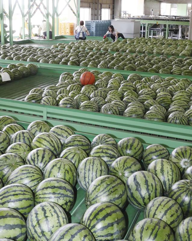 Rows of greenhouse-grown watermelons await shipping in Mashiki, Kumamoto Prefecture, which was devastated in the Kumamoto Earthquake in 2016. The watermelons, harvested on Wednesday morning, are guaranteed to be sweet because of their high average sugar content. The melons are seen at the Japan Agricultural Cooperative's local grading facility, where they are sorted by characteristics such as weight and sugar content, then assigned a grade by a machine. Shipping of watermelons produced in Mashiki is at its peak, with about 300,000 of the fruits mainly ticketed for delivery in the Kanto region by mid-June.
