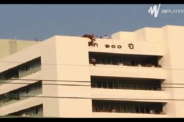 A video clip posted online on Monday by Facebook user Noom Muangnon showed hospital staff risking their own safety and pulling the girl back up onto the rooftop.