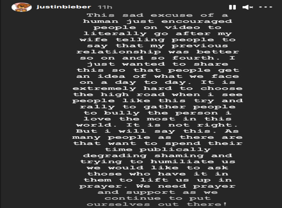 Bieber said that rather than let the fan “steal my joy”, he realised “how miserable she must be to want to spend her life trying to make others feel small”.