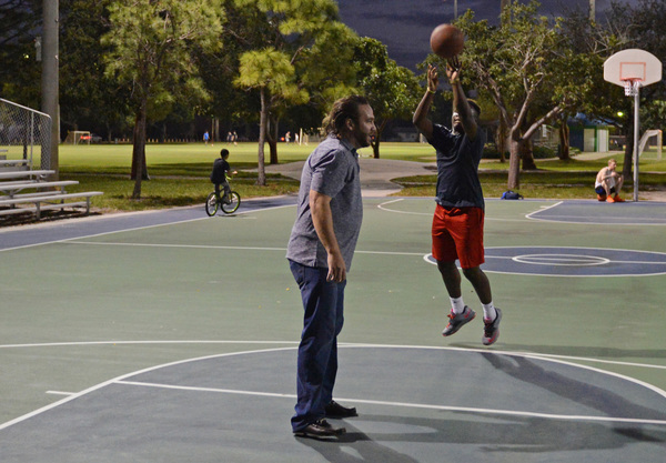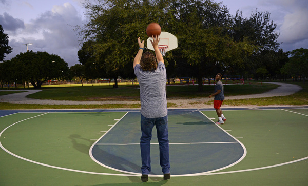 The 17-year-old catches it, focuses on the hoop ahead and shoots a three-point basket just before dusk at Holiday Park in Fort Lauderdale. They were on day five of their challenge to shoot three-pointers.