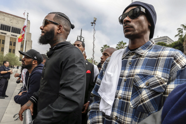As the graduation commenced, a group of people, many from South Los Angeles, led by rappers Snoop Dogg and The Game, marched up to the metal barricades that blocked off the plaza. They were there, one man said, not to protest the police, but to try to "make things better."