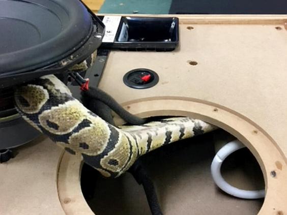 Sophie Lee, 24, was opening up the speakers to assess the problem at Correct Service in Carlton, Nottingham, when she noticed the royal python named Slithy.